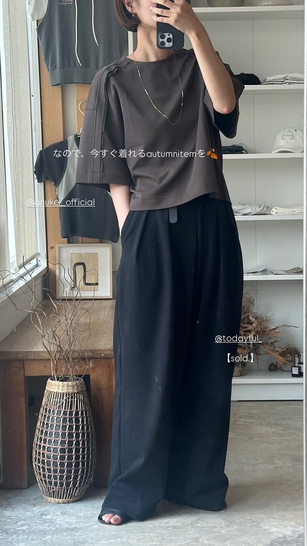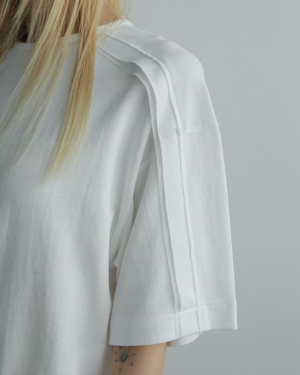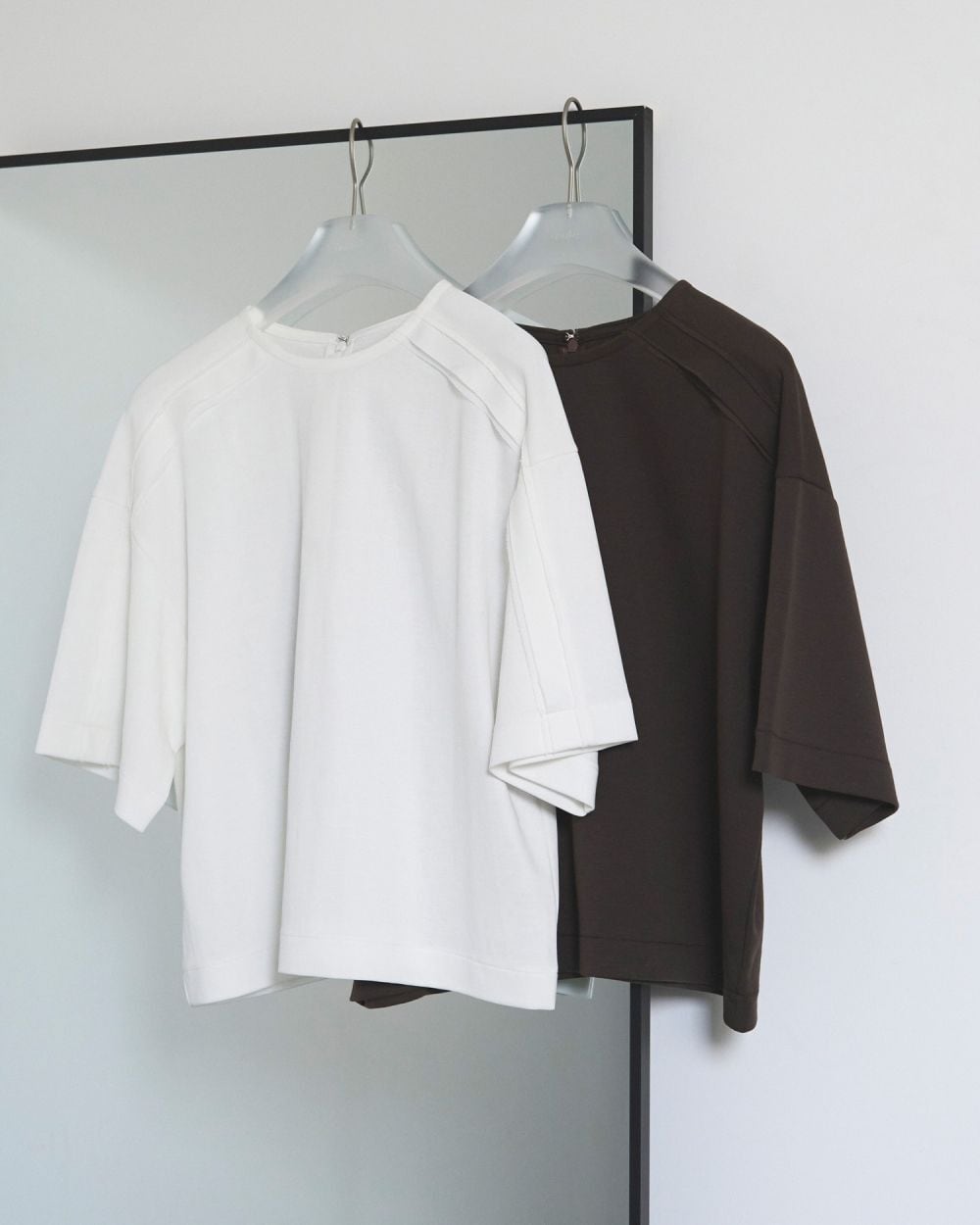 上品なポンチ素材で仕上げたデザインTシャツ。前振りのショルダーデザインで、カットオフした別布を重ねた切り替えディテールで、モードな印象を纏っていただけます。ワイドなボディとショート丈のバランスが絶妙で、柄ボトムやワイドパンツとも好相性。首周りはスッキリとコンパクトに仕上げ、背面のファスナーでスマートに着脱可能です。シンプルながらも個性が光る一着。