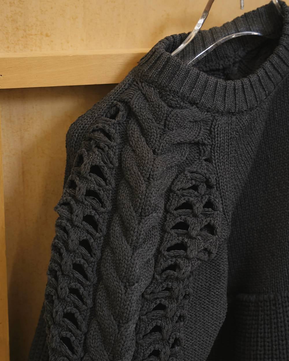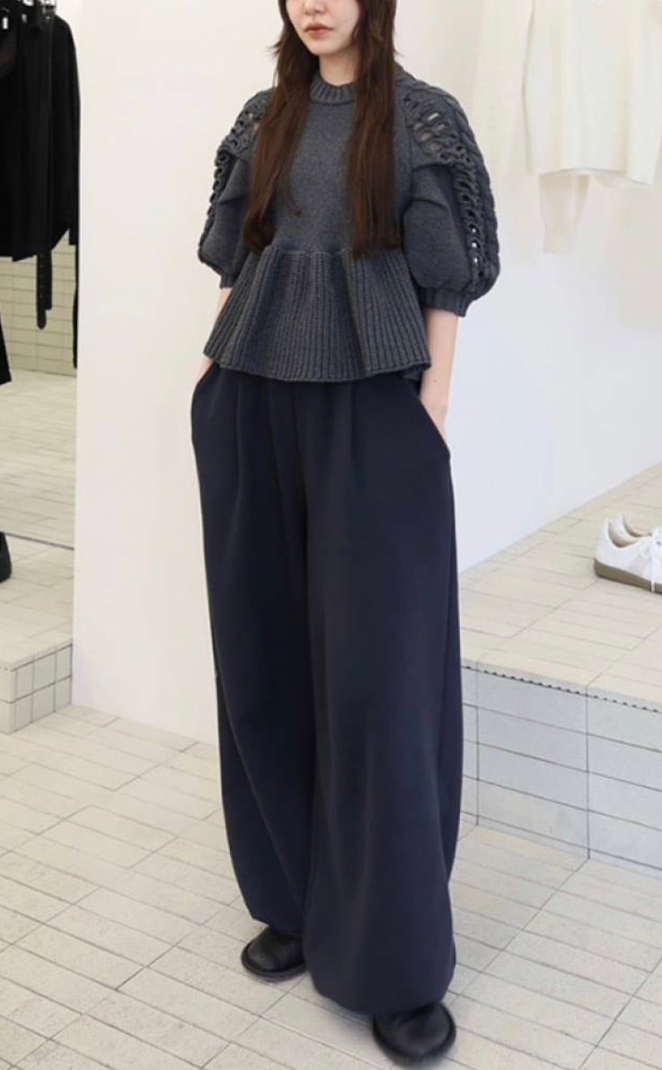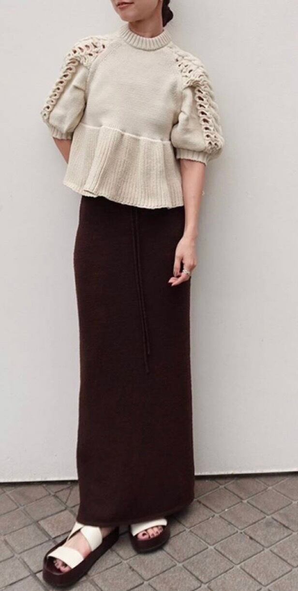 編地の変化で表情をつけたニットトップス。袖はケーブルと透け感のある編み柄を組み合わせ、たっぷりタックを入れることで立体感のあるパフスリーブに仕上げました。裾はペプラムデザインで、女性らしさとシルエットのメリハリを演出。存在感がありながらもデイリーに取り入れやすい一枚です。