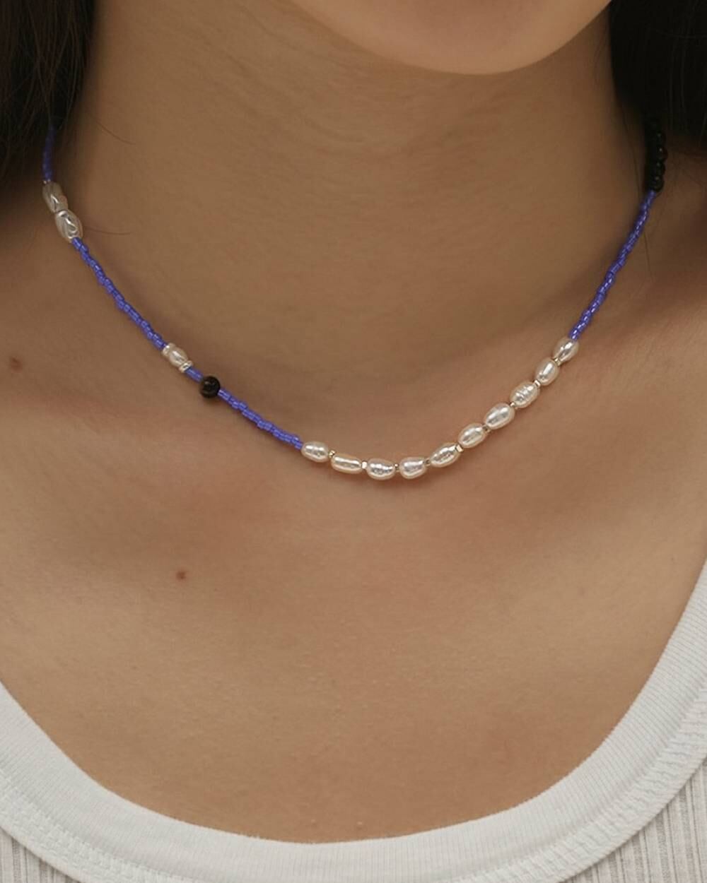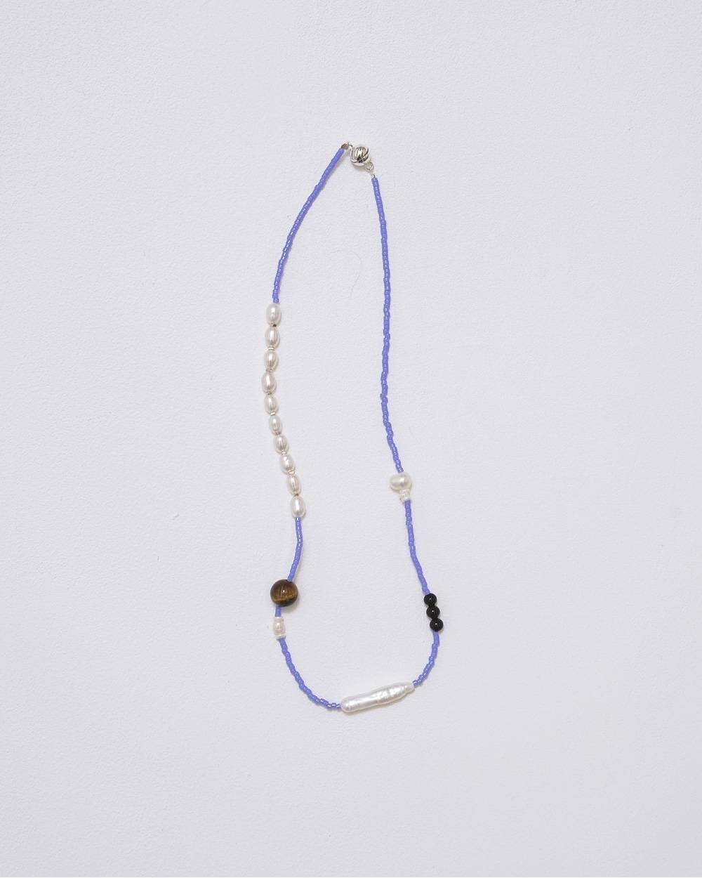 ガラスビーズをベースにオニキス・タイガーアイ・淡水パールなど異なる質感をミックスさせたチョーカー。ランダムに配置された天然素材が、ほどよい抜け感とニュアンスを演出。華奢ながらも存在感があり、シンプルなスタイリングに合わせるだけでこなれた雰囲気に仕上がるアイテムです。